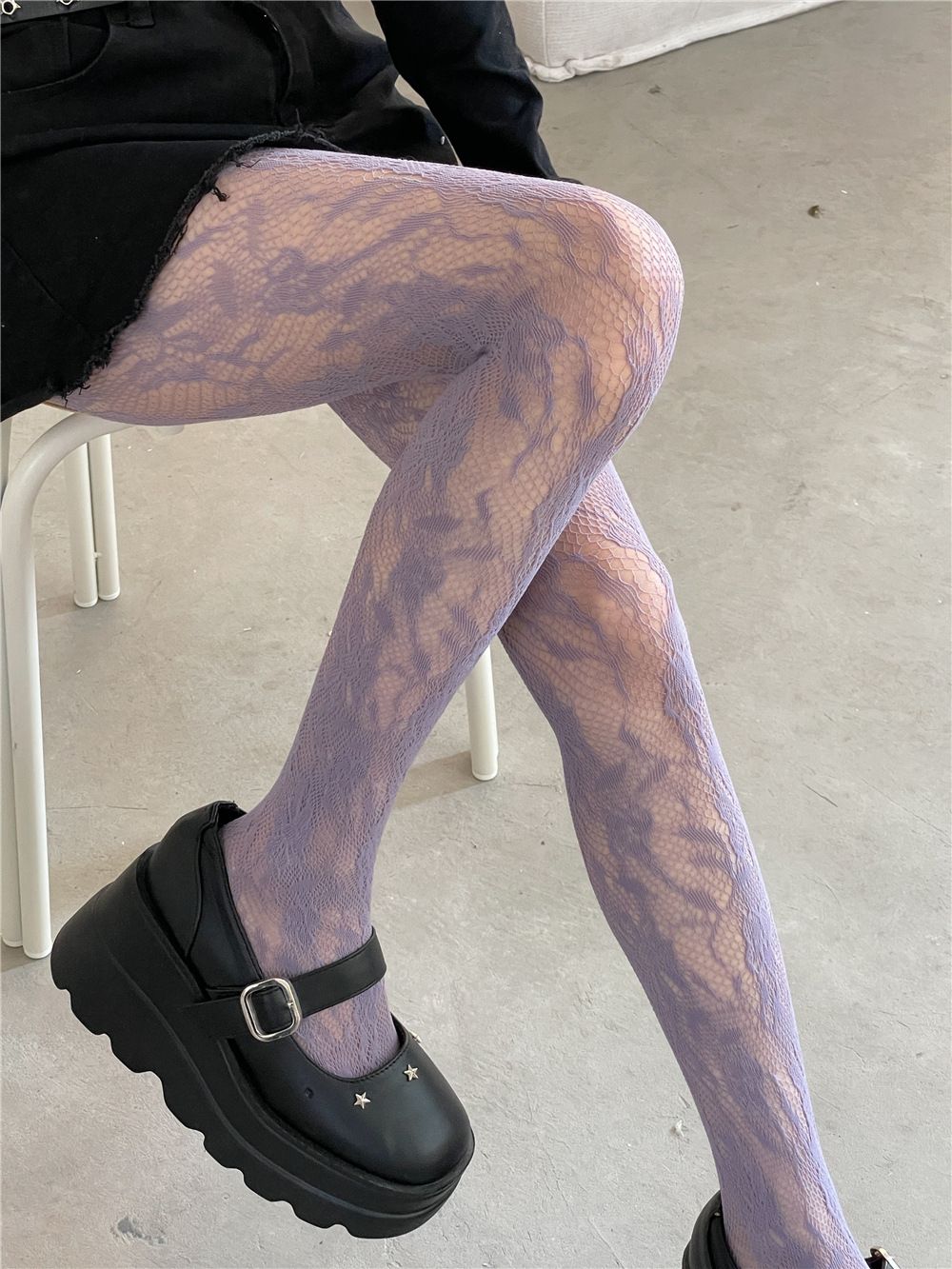 繊細な花柄レースが全体に広がる網タイツは、脚元を華やかに彩る一枚です。