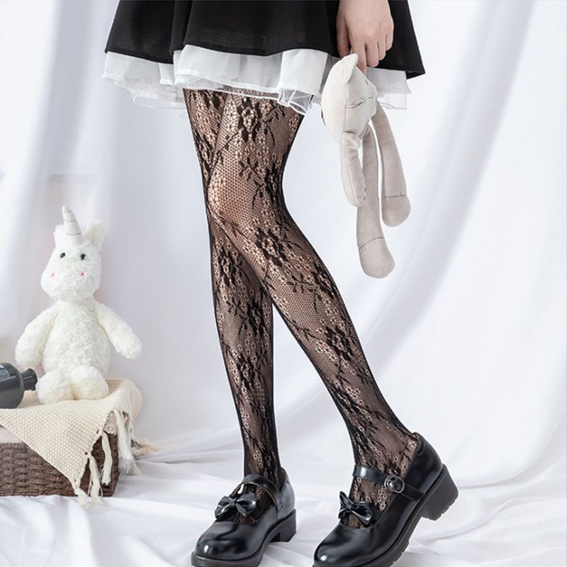 繊細な花柄レースが脚全体を優雅に彩る網タイツです。