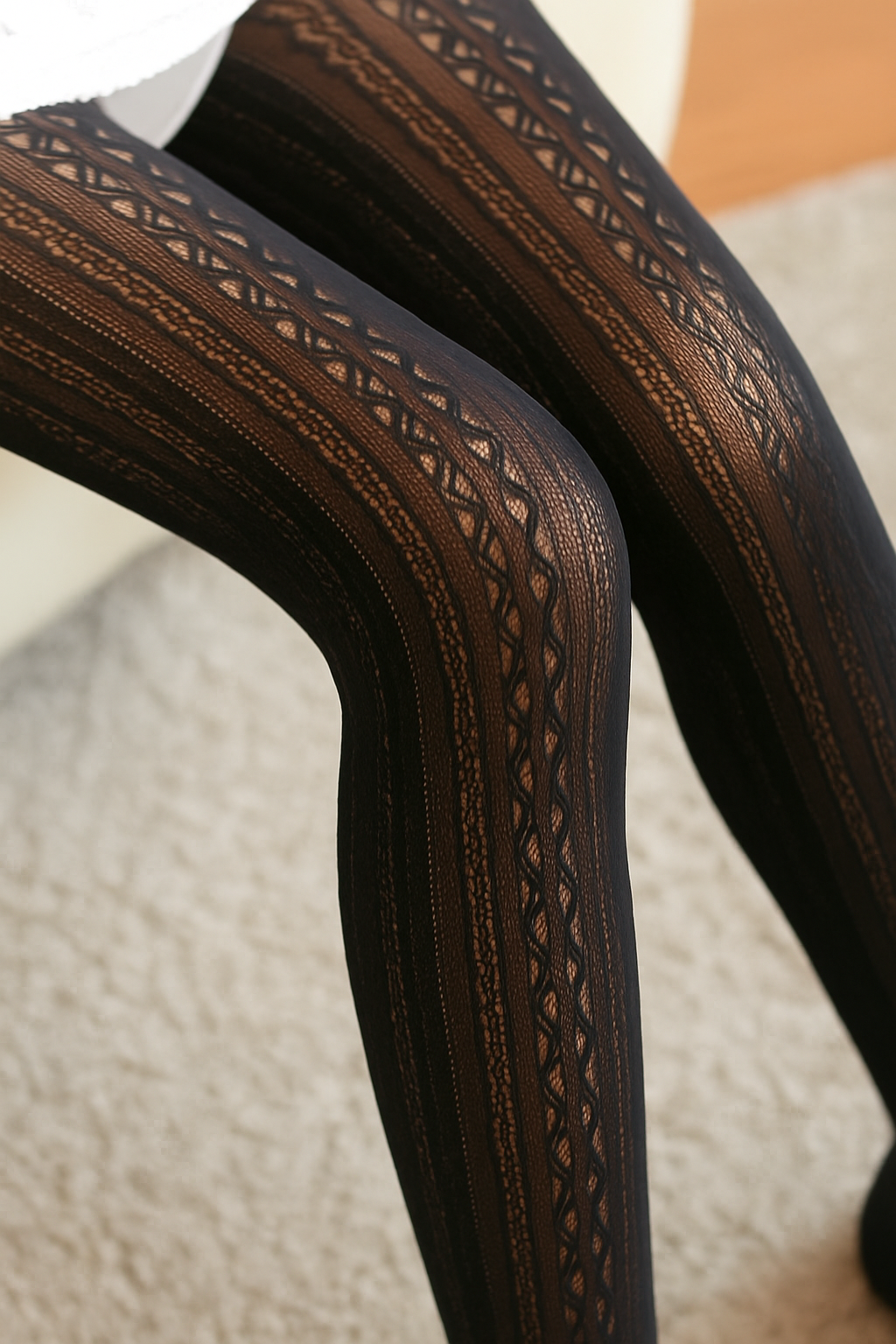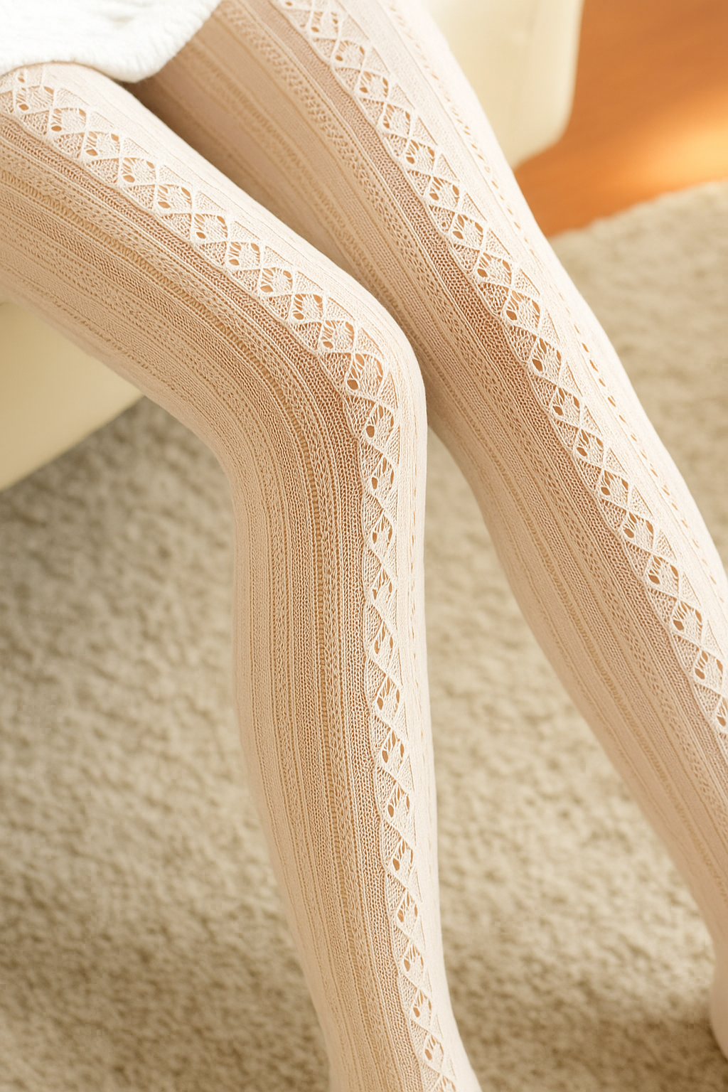 繊細な透かし編みの網目が美しい縦ラインを描く上品なタイツです。
